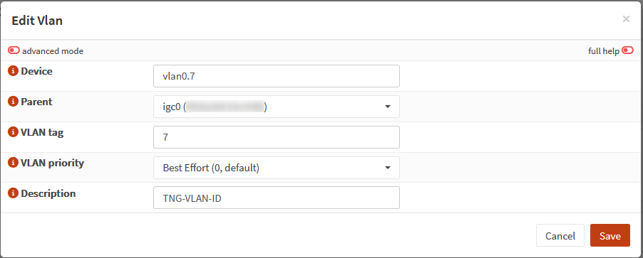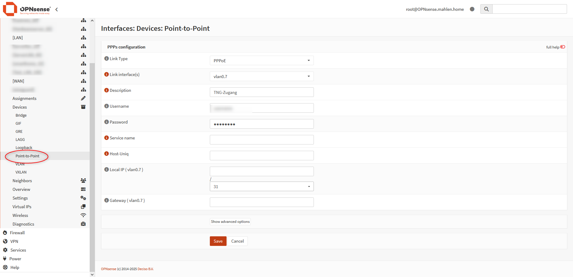 Unter WAN das erstellte Interface auswählen, pppoe0 (vlan0.7) - TNG Zugang….